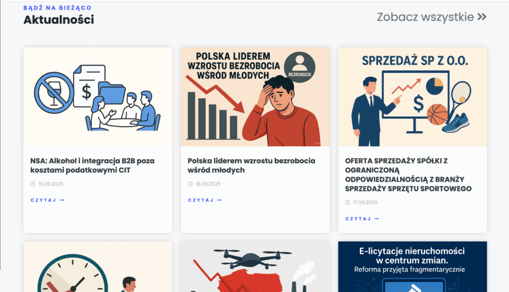 Sekcja „Informacje z rynku”: krótkie artykuły i komentarze dot. rynku (np. podatki, nieruchomości komercyjne, e-commerce a magazyny).