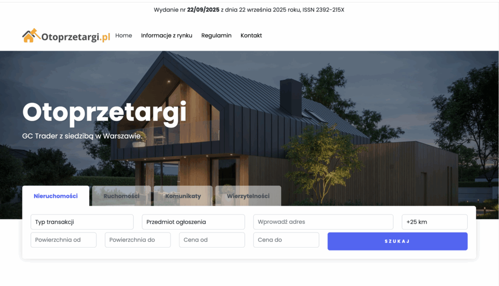 OtoPrzetargi.pl to polski portal ogłoszeń przetargowych i sprzedaży (publicznej oraz upadłościowej) z czterema głównymi sekcjami: Nieruchomości, Ruchomości, Komunikaty i Wierzytelności. Serwis publikuje oferty m.in. gmin, starostw, spółek oraz syndyków. W nagłówku wskazany jest wydawca: GC Trader z siedzibą w Warszawie; w stopce widnieje adres ul. Wasilkowskiego 1a lok. 10.