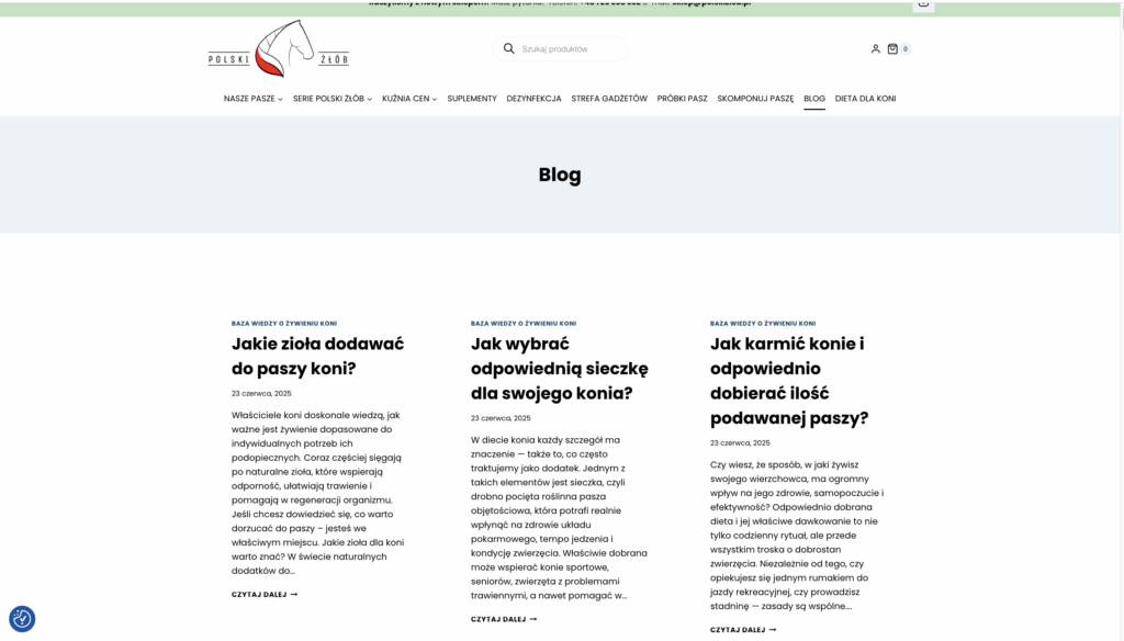 Blog / sekcja porad dotyczących żywienia i zdrowia koni – budowanie pozycji eksperta.